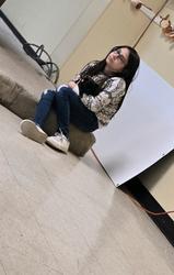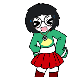 *the girl blinks a bunch of times with a music note playing each time, then shakes her head comically in disbelief, looks at the camera and points with her thumb at me in disbelief, sound effect playing in sync*
